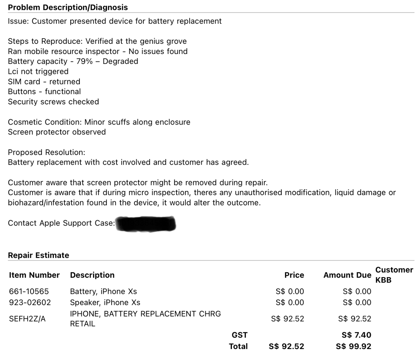 2023년 3월 1일부터 한국은 아이폰 X/XS 수리비가 72,2000 -> 109,800으로 인상된다고 한다. 그럼 내가 여기서 교체를 하는 비용이 99.92SGD 이니까 오늘 기준환율로 96,250원에 교체를 하게 되는 거다. 그럼 당연히 배터리 스트레스 받지말고 바로 교체를 하기로 했다.