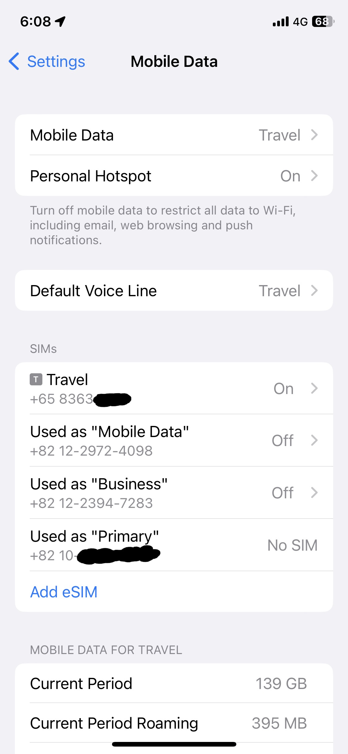 - 셋팅에 들어가서 Mobile Data 용으로 prepaid eSIM으로 셋팅해둔 이름을 선택하면 된다. 아래 캡쳐화면은 싱가포르에 돌아와서 찍은 거라서 Mobile Data 에 Travel 이라는 이름의 싱가포르 현지번호로 셋팅을 해둔 화면이다. "Mobile Data", "Business "는 내가 prepaid esim으로 개통을 했던 번호들이다. 이제는 사용기간이 끝나서 사용이 불가능한 상태이다.