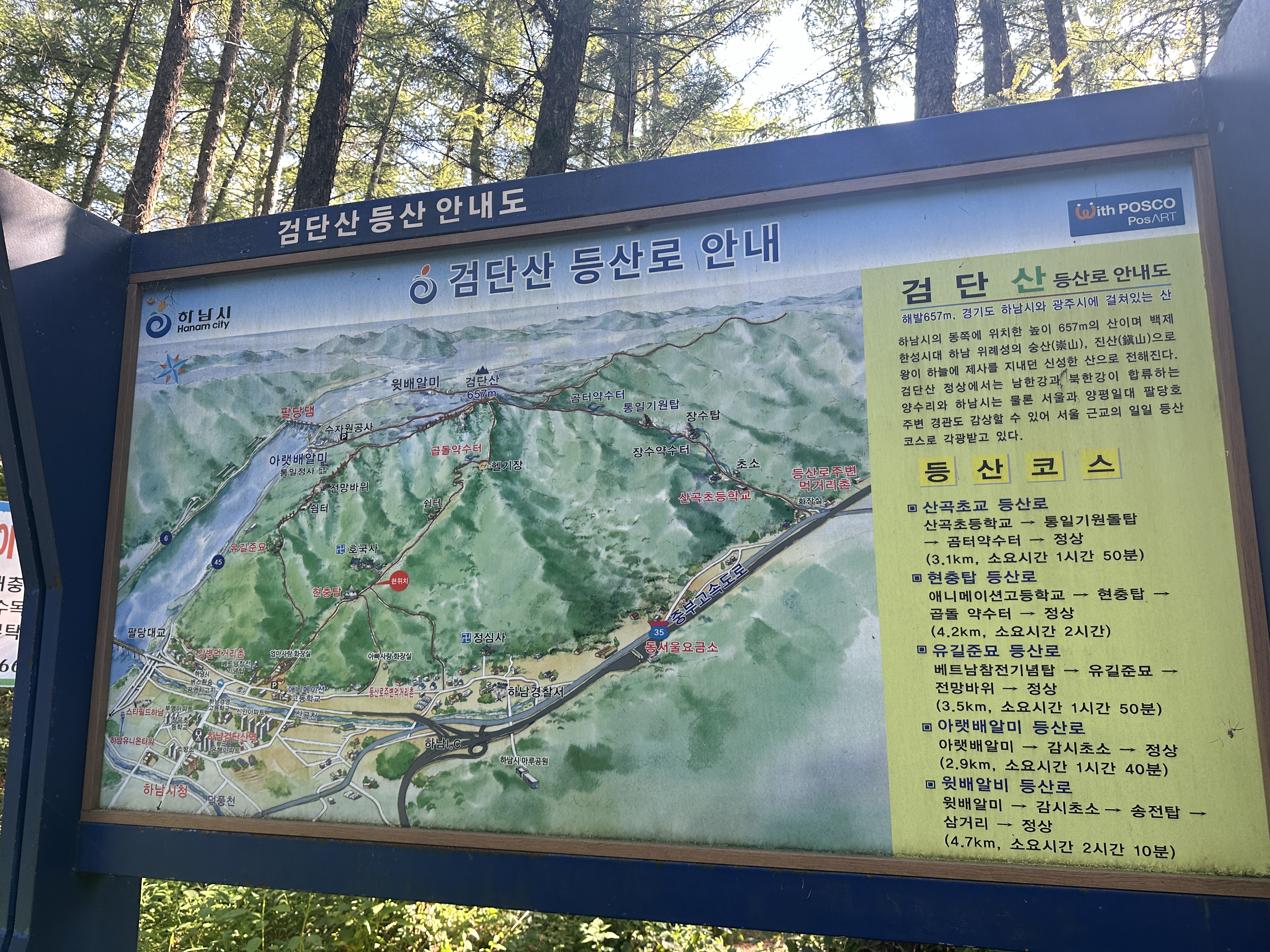 첫 등산은 검단산 해당 657m 의 산이며 백제 한성시대 하남 위례셩의 숭산, 진산으로 왕이 하늘에 제사를 지내던 신성한 산으로 전해진다. 검단산 정상에서는 남한강과 북한강이 합류하는 양수리와 하남시는 물론 서울과 양평일대 팔당호 주변 경관도 감상할 수 있어 서울 근교의 일일 등산 코스로 각광받고 있다 라고 등산로 안내에 적혀 있다.