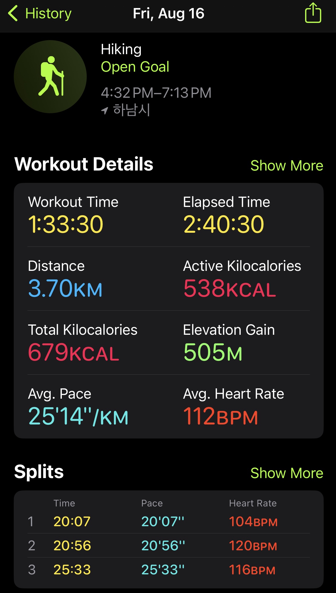 올라갈때 1시간 30분 걸렸다. 3.7km 걸은걸로 나온다. 동네 형의 말로는 중간 레벨은 되는 산이라고 한다.