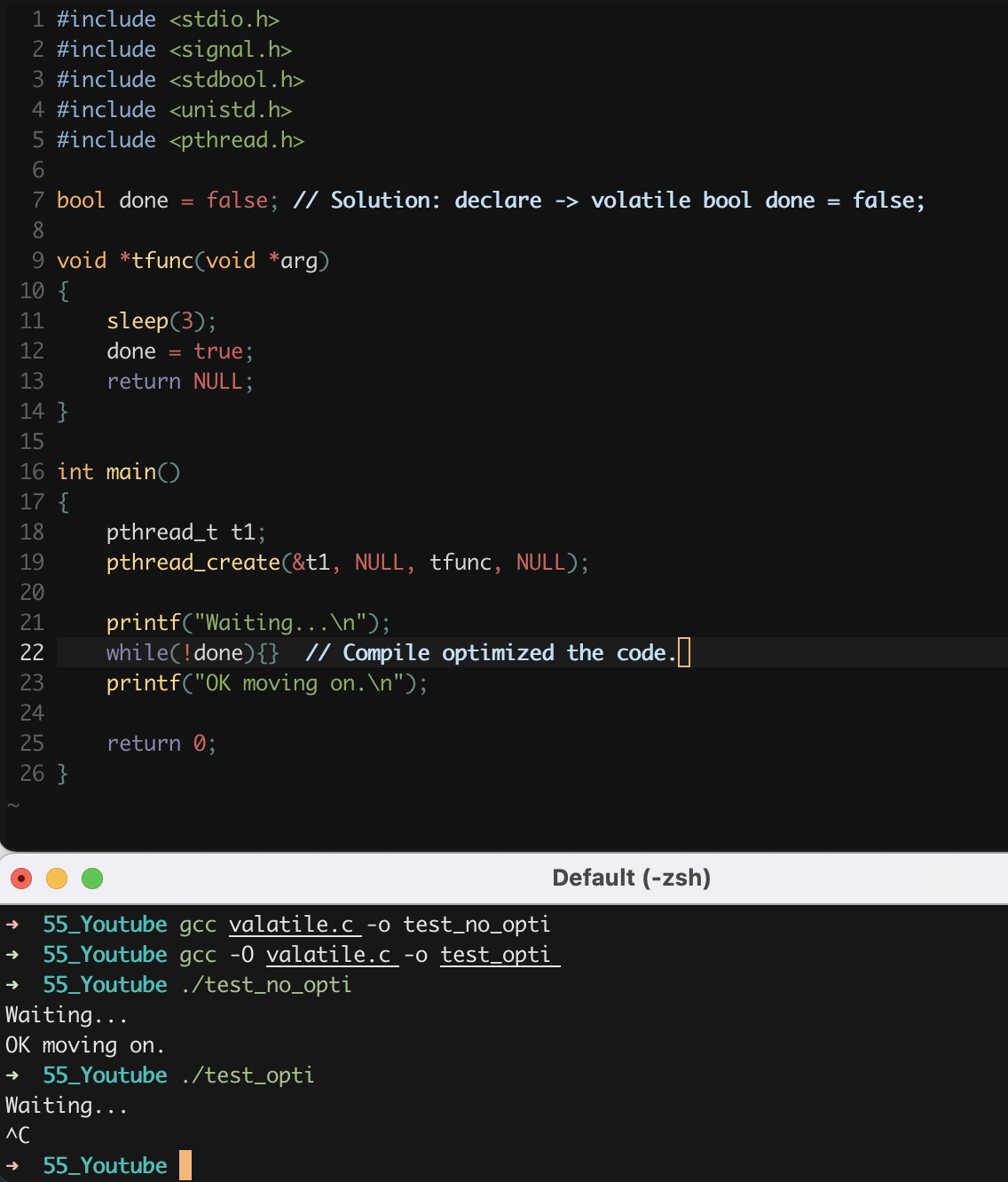 해당 코드가 참 좋은 예제가 된다. line 22 부분이 최적화 옵션으로 compile를 해버리면 항상 True로 인식이 되어 버리게 되어서 While 에 영원히 빠져 있게 되어 버린다. Thread에서 tfunc()을 실행하는 부분이 의미가 없게 되어 버린다.