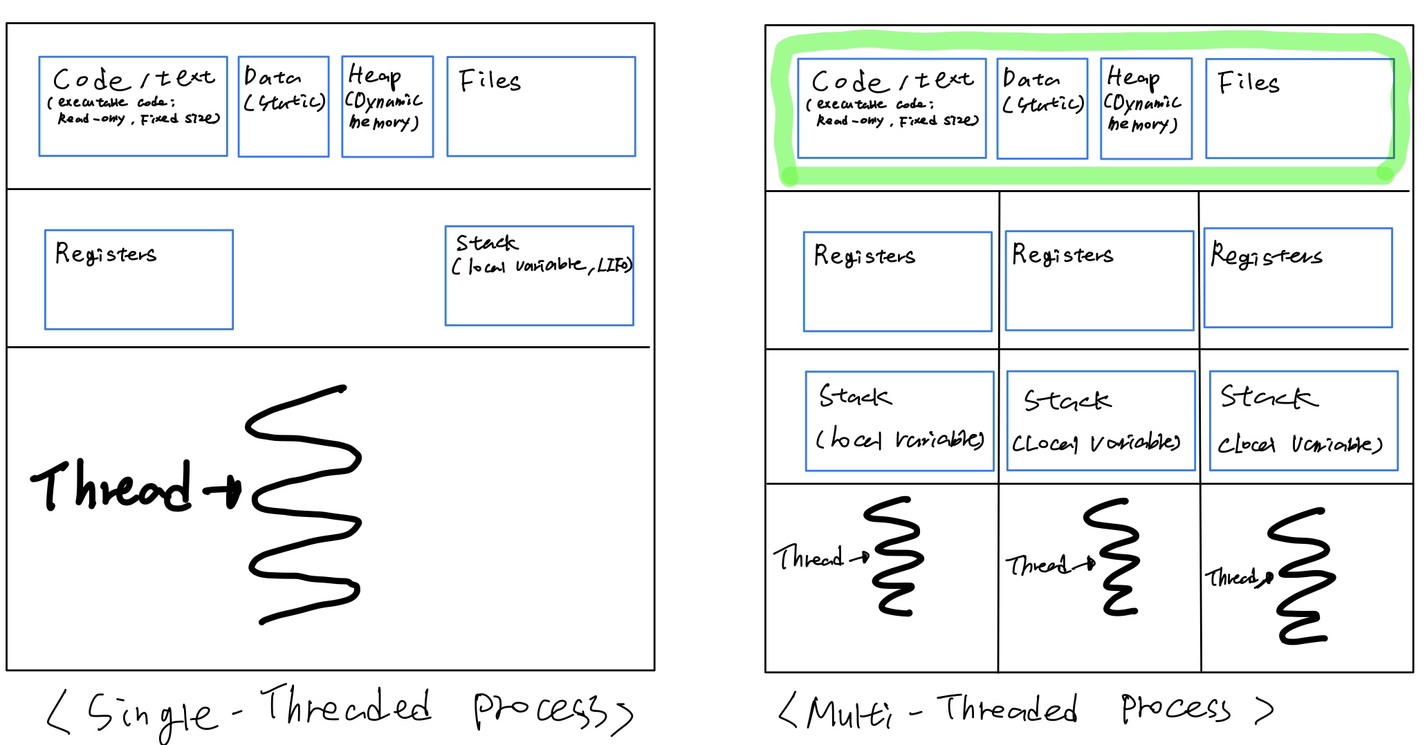 - It shares with other threads belonging to the same process its code section, data section and other operating-system resources, such as open files and signals.