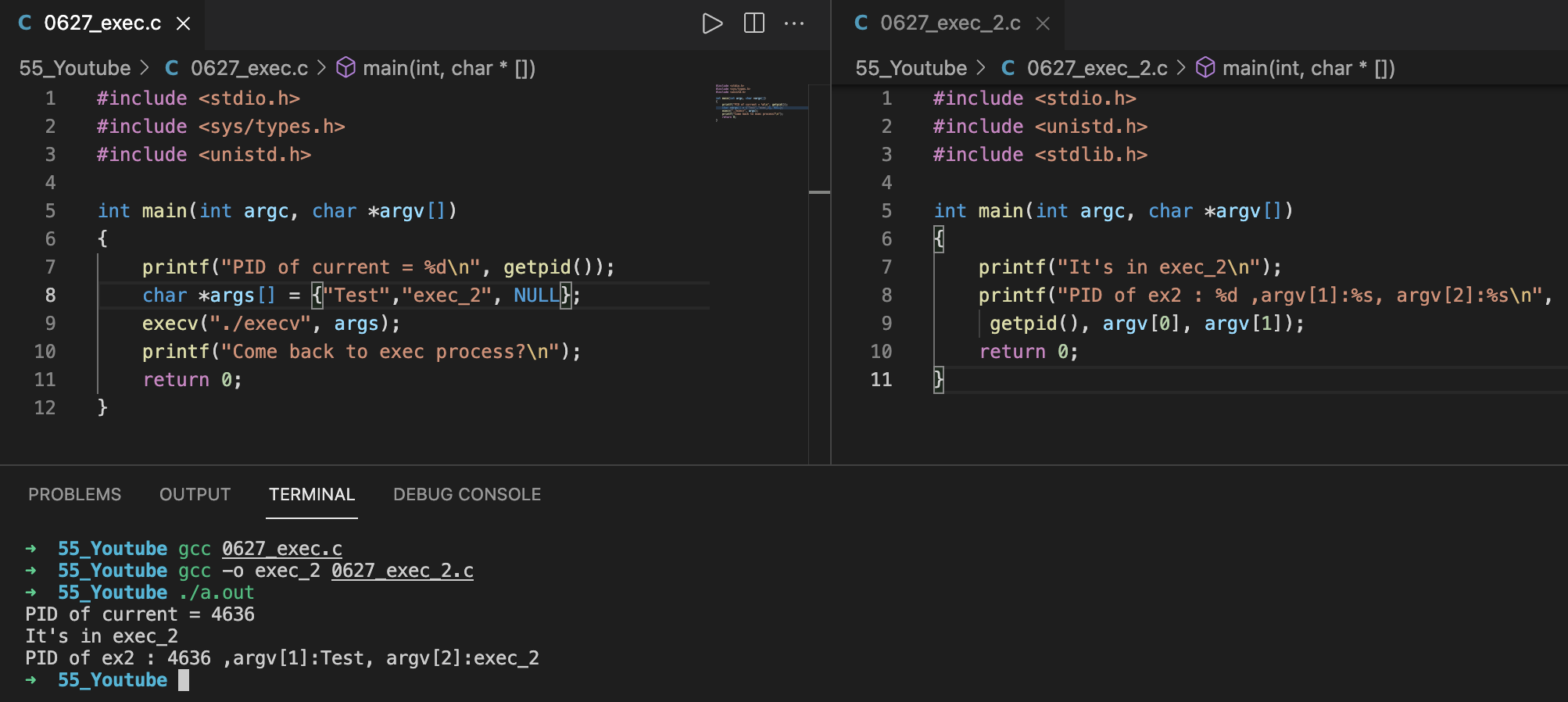 exec 를 사용하게 되면 기존에 사용하던 process 를 대체하게 되서 exec_2 를 실행하게 되고 다시 기존 exec process로 돌아가서 실행을 하지 않는다.